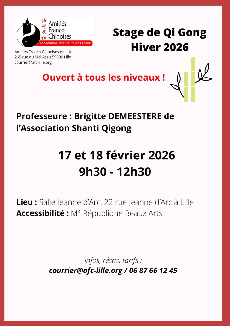 Stage Qigong – 17 et 18 février 2026 Conférence : Figure de femmes en Chine: entre traditions, mutations et regards de cinéastes. Leave a Reply Annuler la réponseYour email address will not be published.Your Comment:You may use these HTML tags and attributes: <a href="" title=""> <abbr title=""> <acronym title=""> <b> <blockquote cite=""> <cite> <code> <del datetime=""> <em> <i> <q cite=""> <s> <strike> <strong> Nom * E-mail * Site web Enregistrer mon nom, mon e-mail et mon site dans le navigateur pour mon prochain commentaire.
